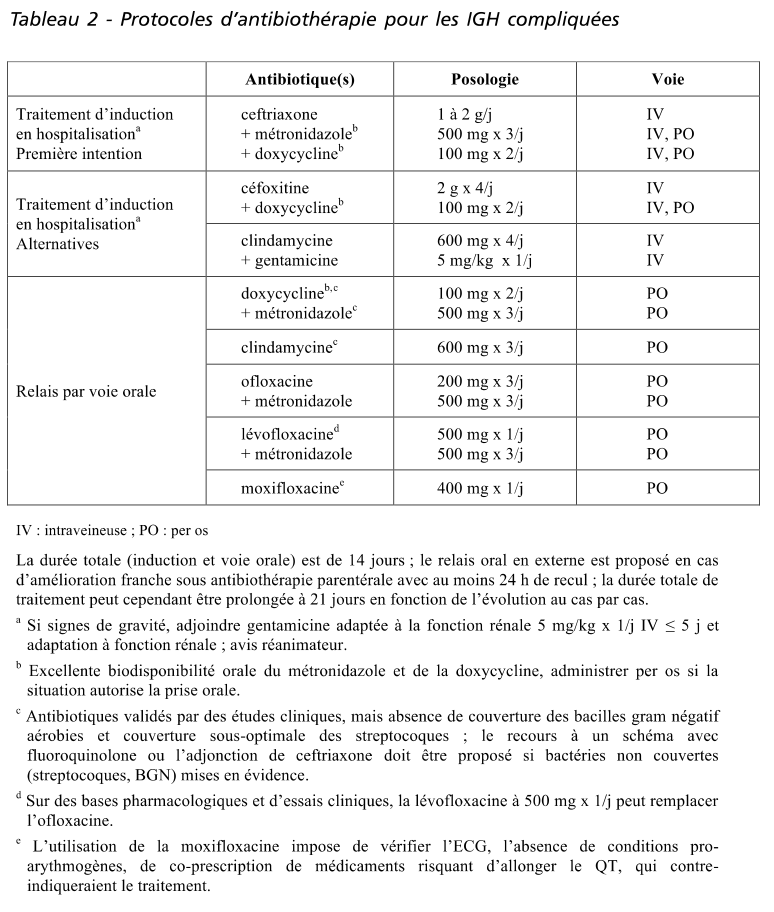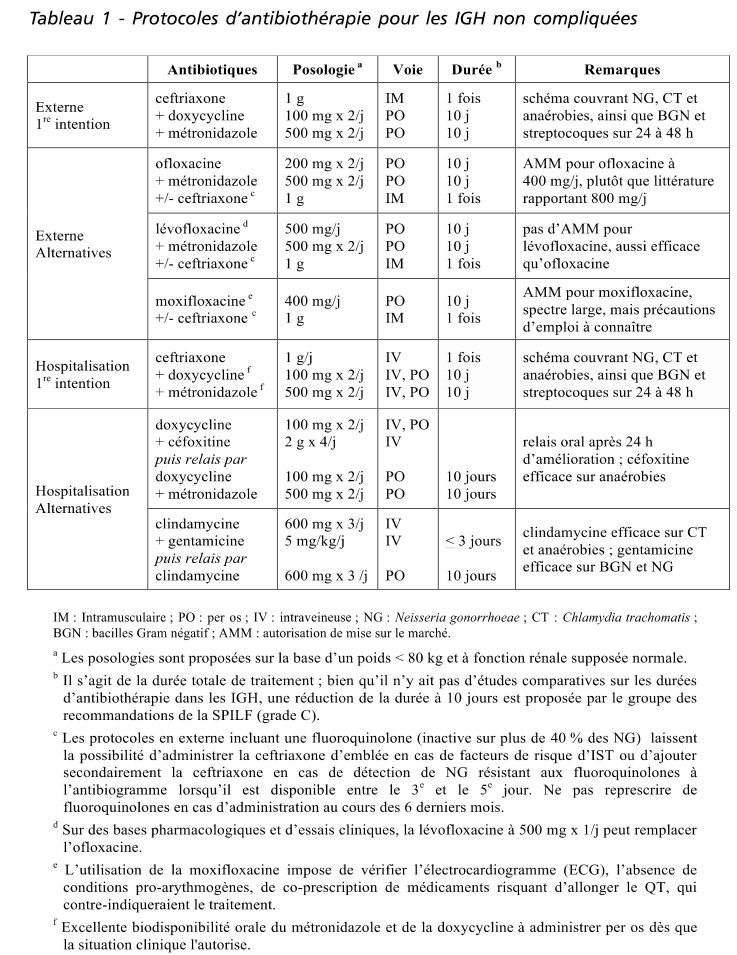 Ceftriaxone 1g IM 1 fois, Doxycycline 100 mg x 2 / j per os et Métronidazole 500 mg x 2 / j per os